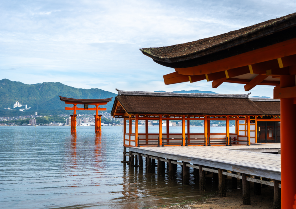 Located on the island of Itsukushima in Hiroshima Prefecture, Itsukushima Shrine is a UNESCO World Heritage Site and attracts many visitors from both Japan and abroad. The shrine is symbolized by its Great T orii Gate, which appears to float on the water at high tide, creating a unique and captivating sight.
