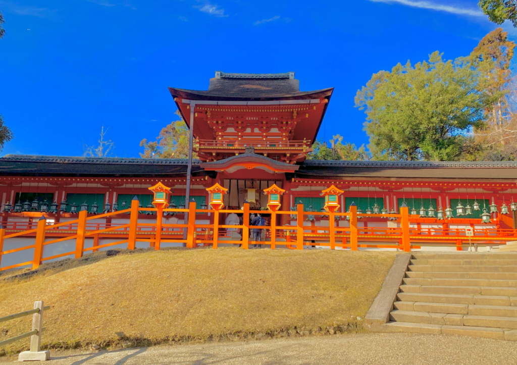 The torii gate of Kasuga Taisha is surrounded by lush natural beauty, with the bright vermilion of the gate contrasting beautifully against the changing colors of the seasons. Particularly during autumn foliage or the vibrant greenery of spring, the contrast between the gate and nature enchants visitors. Behind the shrine lies the Kasuga Primeval Forest, designated as a UNESCO